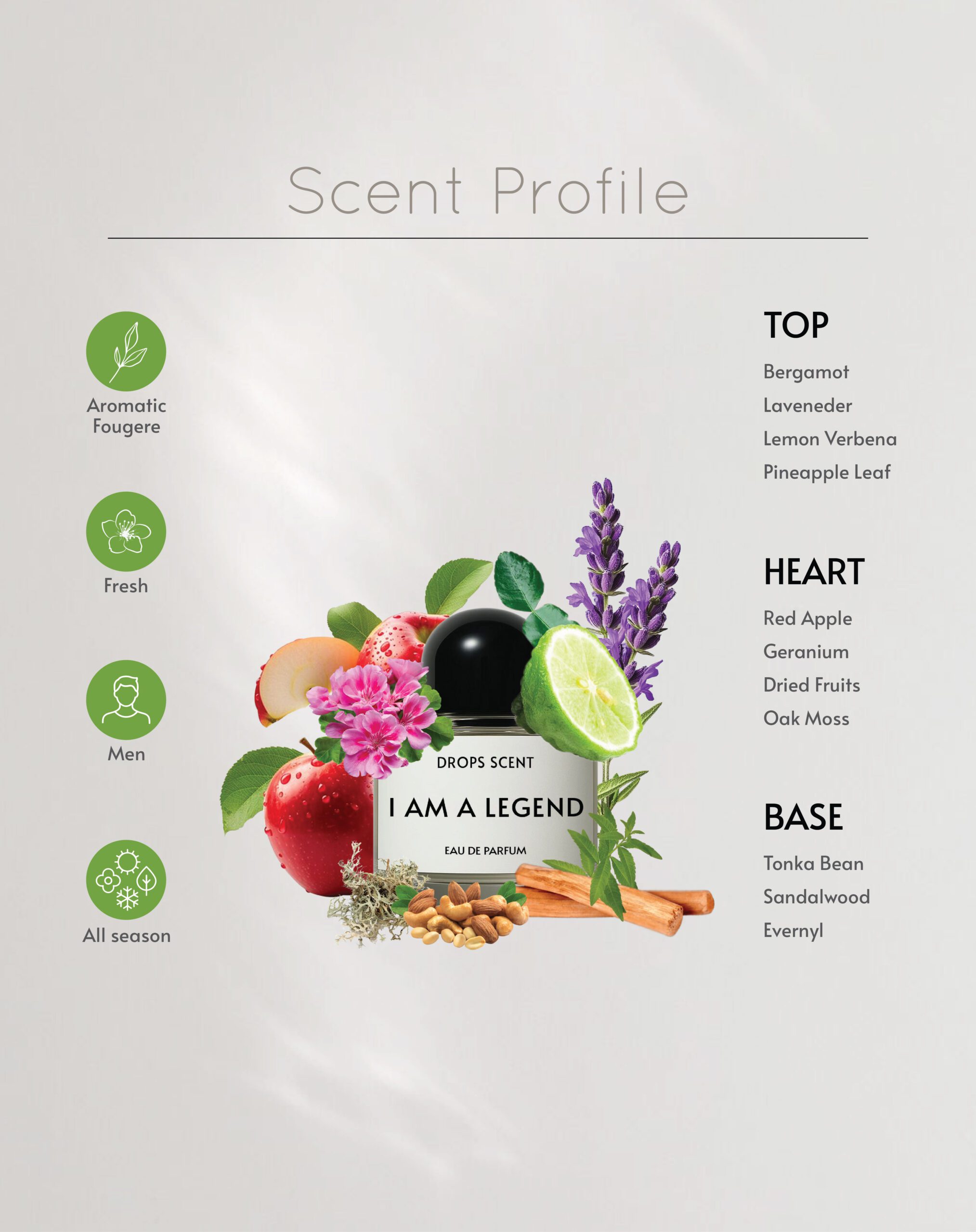 Balanced and compelling, I am a Legend fuses crisp citrus and juicy red apple with floral-green heart notes and a warm, mossy dry down. It evolves subtly on skin — refined and masculine, with just the right amount of intensity.