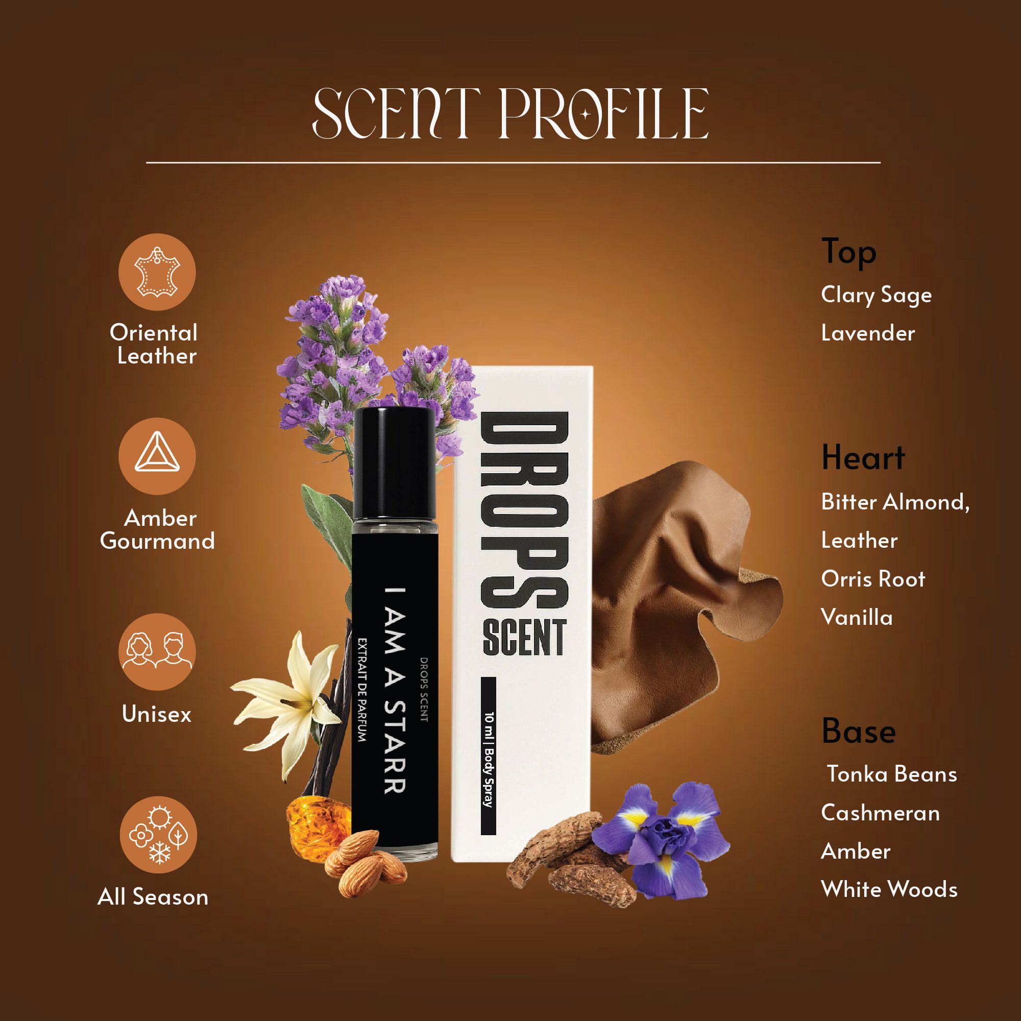 Unleash your inner confidence with I Am A Starr, an audacious fragrance that embodies luxury and boldness. This Oriental Leather scent opens with invigorating clary sage and aromatic lavender, setting the stage for a heart that captivates with rich leather, bitter almond, and smooth orris root.