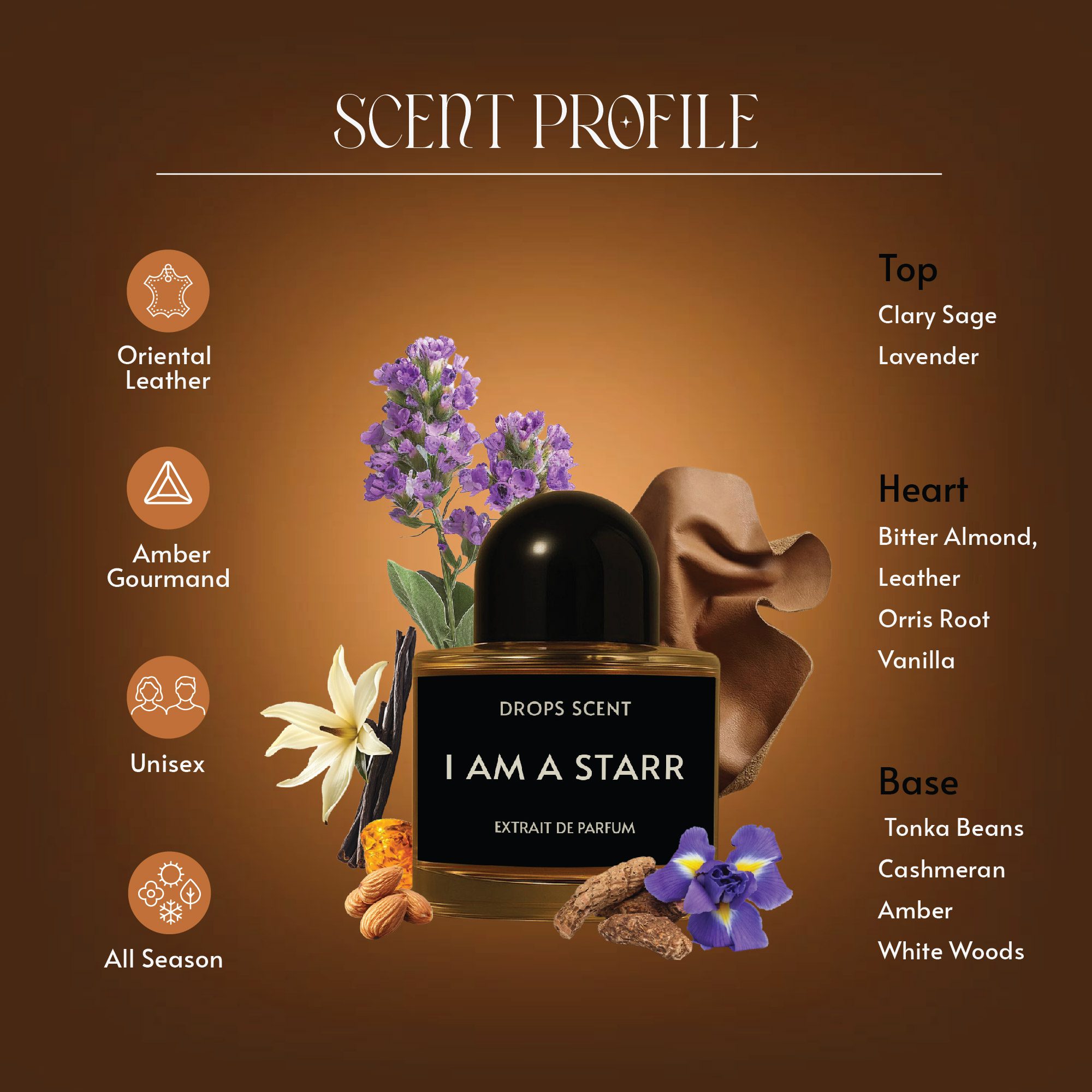 Unleash your inner confidence with I Am A Starr, an audacious fragrance that embodies luxury and boldness. This Oriental Leather scent opens with invigorating clary sage and aromatic lavender, setting the stage for a heart that captivates with rich leather, bitter almond, and smooth orris root.