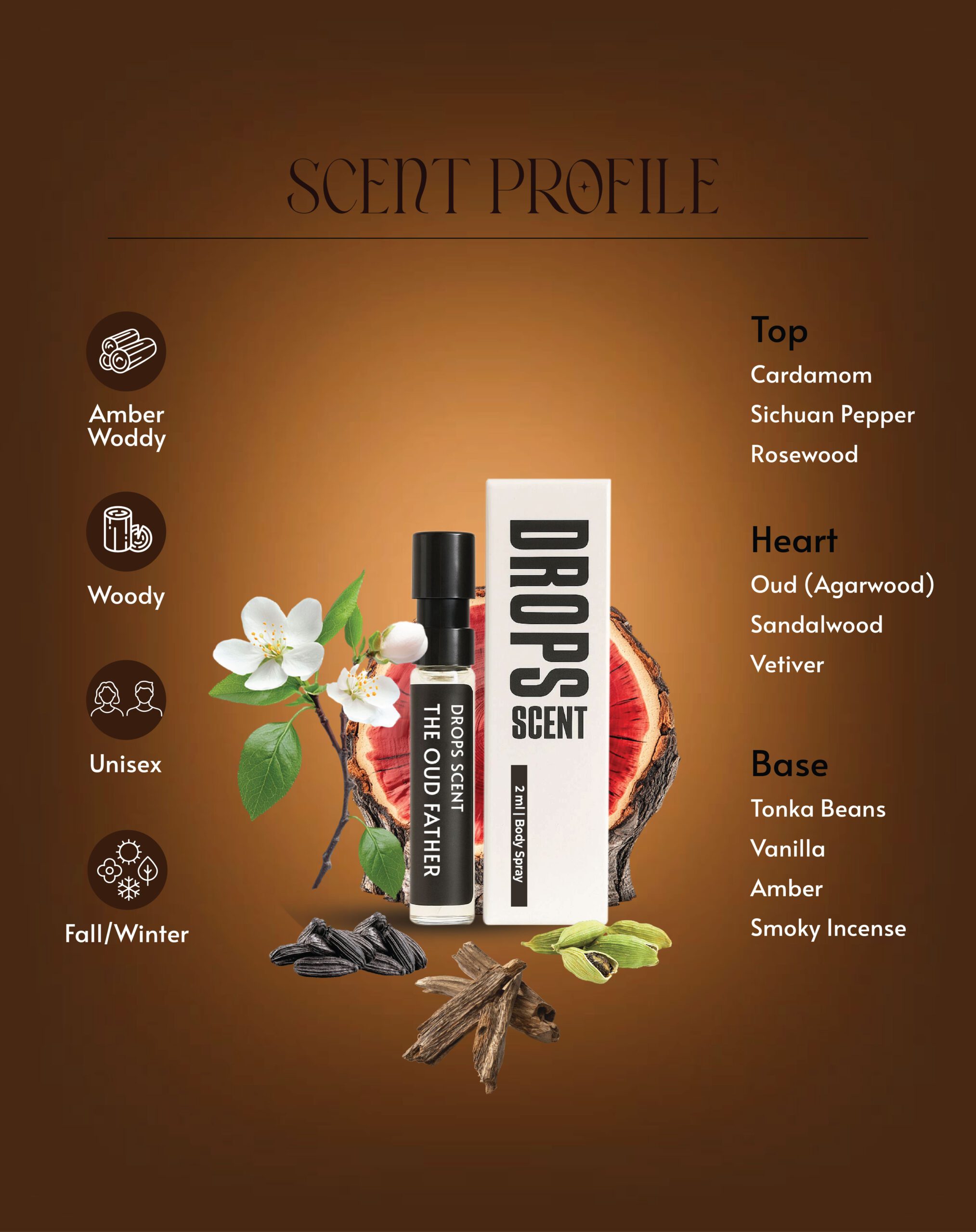 The OudFather opens with a refined burst of cardamom and rosewood, delivering a spicy warmth that immediately captivates. As the scent unfolds, a heart of sandalwood, vetiver, and rare oud emerges, creating a smoky, woody core that exudes sophistication. The base reveals a sensual blend of tonka bean, vanilla, and amber, adding depth and a lingering, velvety finish.